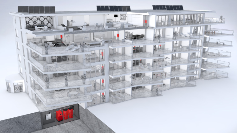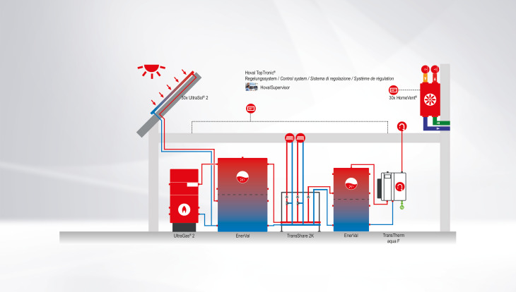 Als Investor wünschen Sie eine möglichst einfache Lösung, die Ihre Investitionen in Grenzen hält und günstig ist im Betrieb. Hoch effizient soll sie gleichwohl sein und mit regenerativer Energie die Vorgaben neuer Energiegesetze erfüllen. Alles möglich! Die Standardlösung von Hoval für Wohnanlagen mit bis zu 25 Einheiten kombiniert einen Gas-Brennwertkessel UltraGas 2 mit thermischen Sonnenkollektoren UltraSol 2, welche die Raumwärme und das Warmwasser liefern. Zur Lösung gehören zudem ein Frischwassersystem TransTherm aqua F, das mit dem UltraGas 2 ein energetisch geniales Duo bildet, und der Heizungsverteiler TransShare, der dem Installateur das Schweißen, Montieren und Isolieren und dem Elektriker das Verdrahten abnimmt.