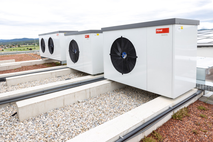 Das Herzstück der Heiz- und Klimatechnik ist eine Kaskade an Hoval Belaria AR Luftwärmepumpen. Sie halten die Temperatur im Bürogebäude auf konstanten 22 Grad. Durch die integrierte Kühlfunktion „CleverCool“ sorgt die Kaskadenlösung auch im Sommer für angenehme Temperaturen – ganz ohne Klimaanlage.