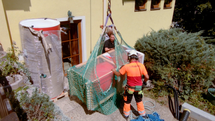 Der Hubschrauber ist wirklich nur dreimal mit Wärmepumpe, Boiler und Pufferspeicher geflogen und der ganze Zauber war in ein paar Minuten vorbei.