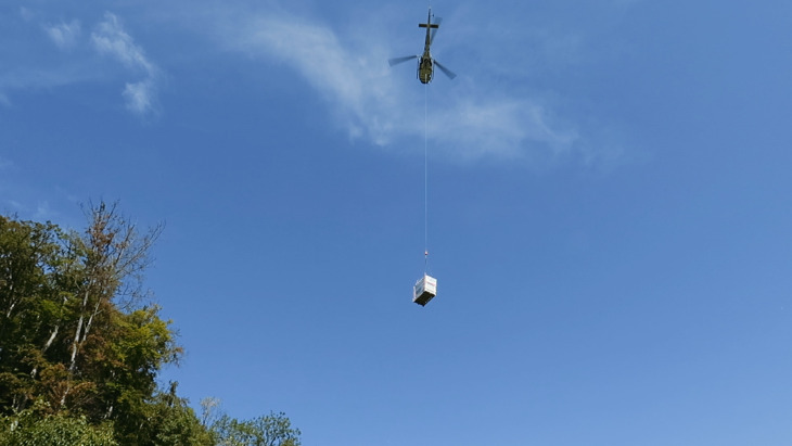 Da sich kein Spediteur fand, der sich dieser Herausforderung stellen wollte, nahm Norbert Loindl den Transport selbst in die Hand und brachte die Gerätschaften zum Aufnahmeplatz. Anschließend nahm der Hubschrauber, welcher extra geordert wurde, die Ware auf und flog die circa drei Kilometer Luftlinie zum Heim der Kunden. Loindl berichtet: