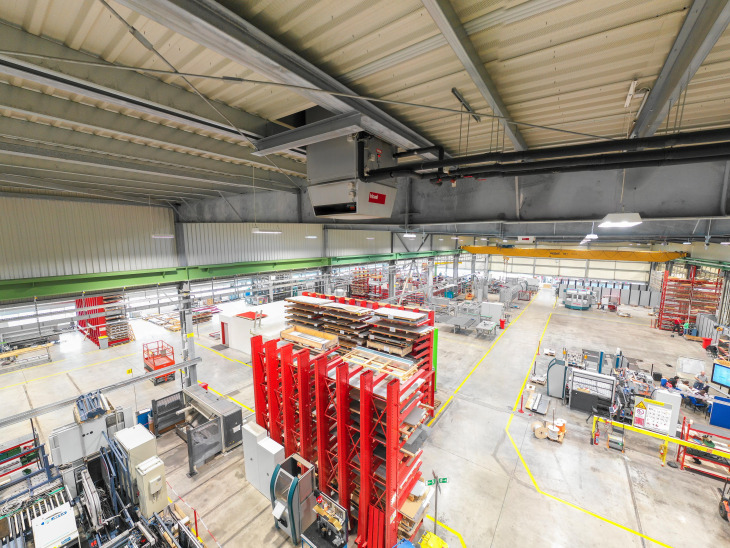 In etwa 10 Metern Höhe sorgen die Geräte von Hoval für ideales Raumklima in den Produktionshallen.