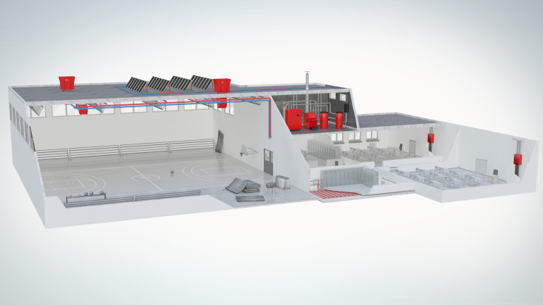 Die Hallenklima-Geräte werden über den Raum verteilt an der Decke oder im Dach installiert. Sie blasen die Zuluft direkt in den Raum ein; es sind keine Zuluft und Abluftkanäle nötig. Das bringt Vorteile beim Platzbedarf, bei der Hygiene und bei der Effizienz.