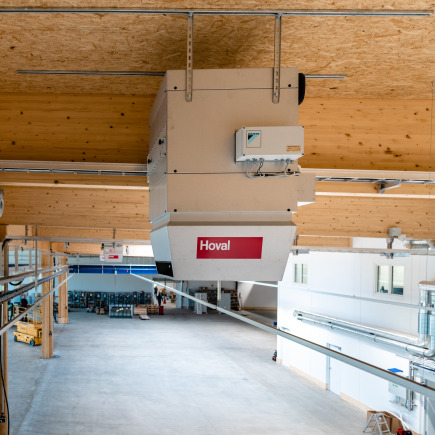Im Zuge des Baus der neuen Fertigungsanlage entschied man sich für eine modulare Lösung von Hoval, die alle drei Anforderungen – Heizung, Kühlung sowie Be- und Entlüftung der Halle – in einem System vereint. So sorgen seit September 2019 zwei RoofVent und zwölf TopVent Geräte in Kombination mit je einer Wärmepumpe für frische Luft und behagliche Temperaturen in der 8.500 m2 großen Halle.
