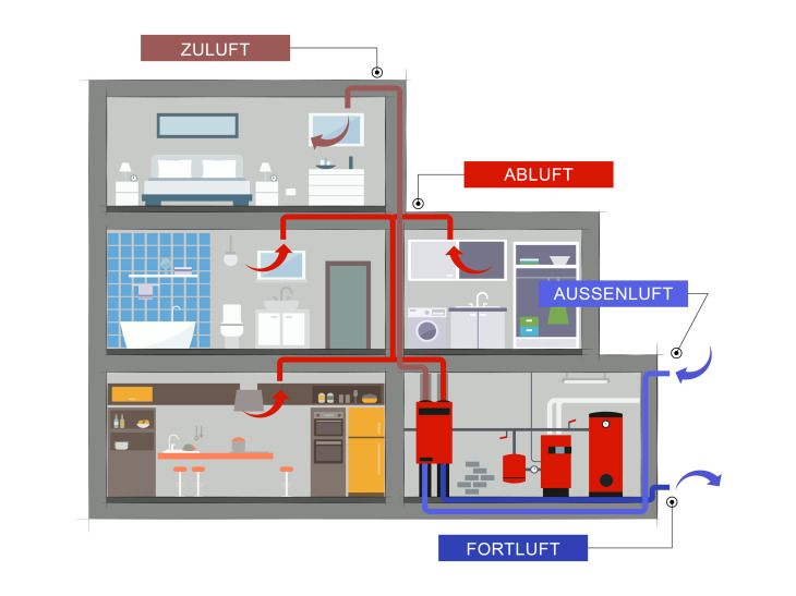 - Ist die Luft verbraucht, wird sie mittels eines Ventils als „Abluft“ abgesaugt und als „Fortluft“ nach draußen geblasen. Dieser Vorgang findet meist in Räumen statt, in denen Gerüche entstehen, also vor allem in Küche, Bad oder WC.